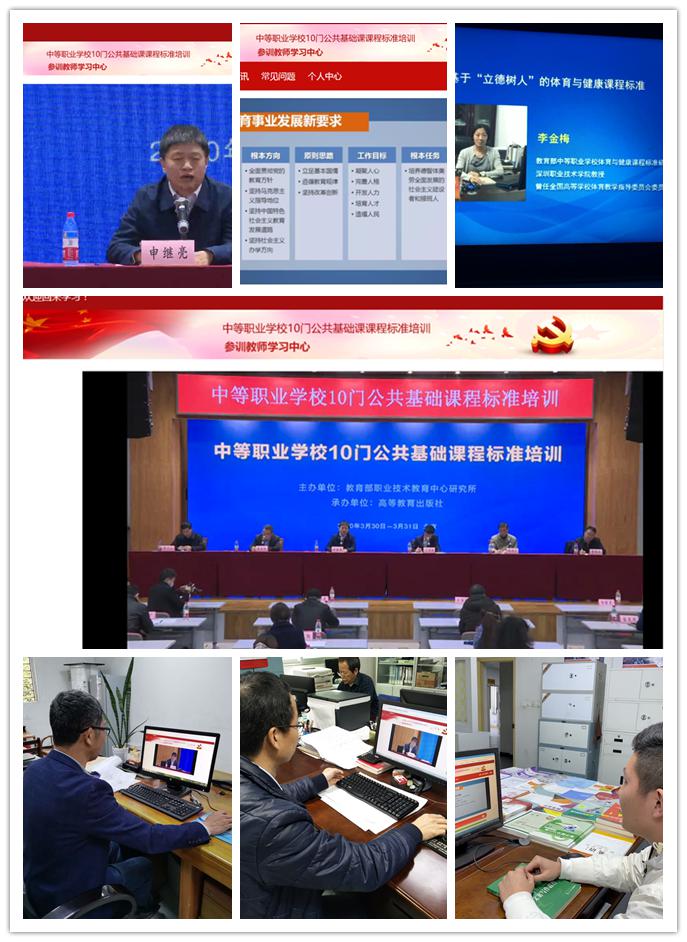 为贯彻落实《国家职业教育改革实施方案》、《关于加强和改进新形势下大中小学教材建设的意见》,落实立德树人根本任务,深化中等职业学校“教师、材料、教法”改革,根据教育部发布的中等职业学校思想政治、语文、历史、数学、英语、信息技术、体育与健康、物理、化学、艺术10门公共基础课课程标准有关要求,我分院于3月30日—31日组织部分专兼任骨干教师参加中等职业学校10门公共基础课课程标准网络培训。