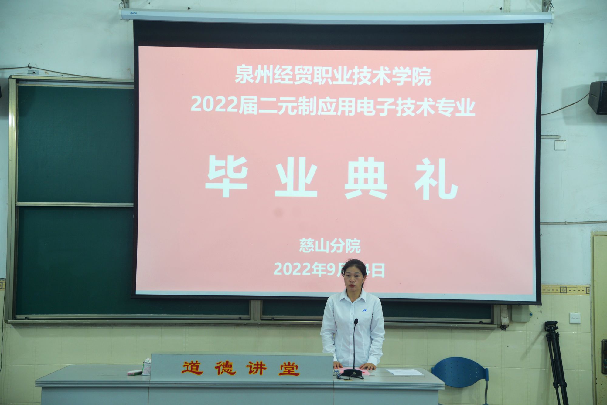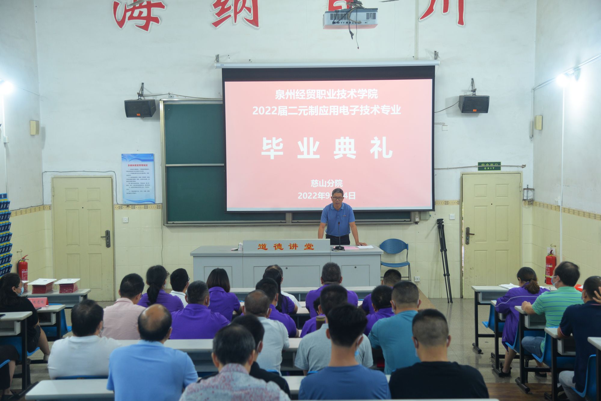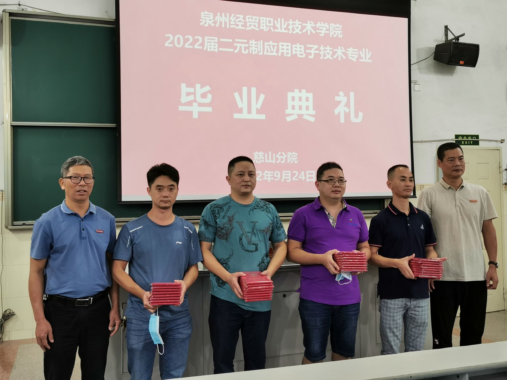 9月24日上午,我院2022届二元制应用电子技术专业毕业典礼在慈山分院举行。泉州半导体高新技术产业园区安溪分园区管理委员会主任白劲松、副主任陈永坚,泉州经贸职业技术学院慈山分院副院长王国阳、李瑞扬出席典礼。园区入驻企业人力资源部主办、慈山分院有关科室领导参加典礼。