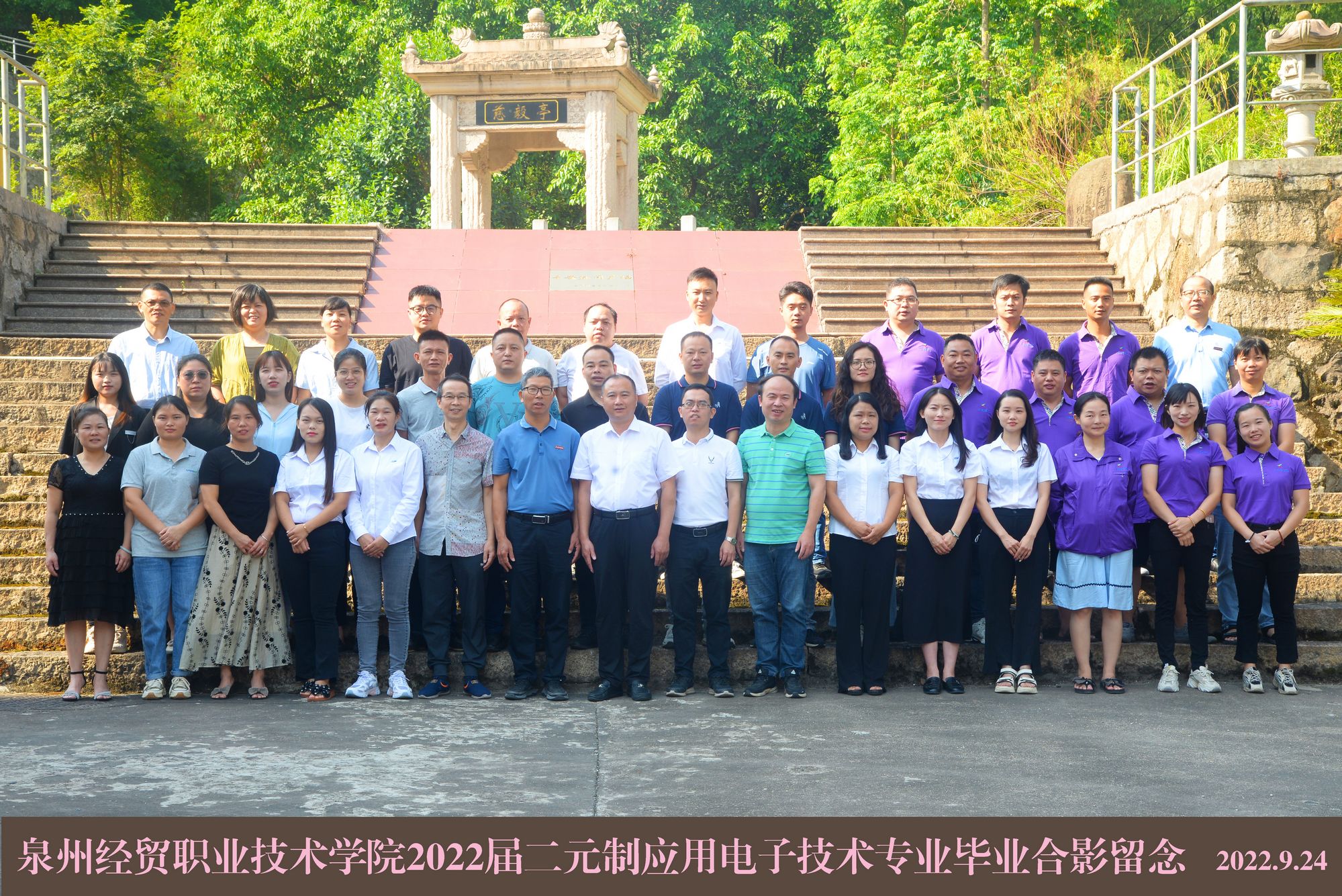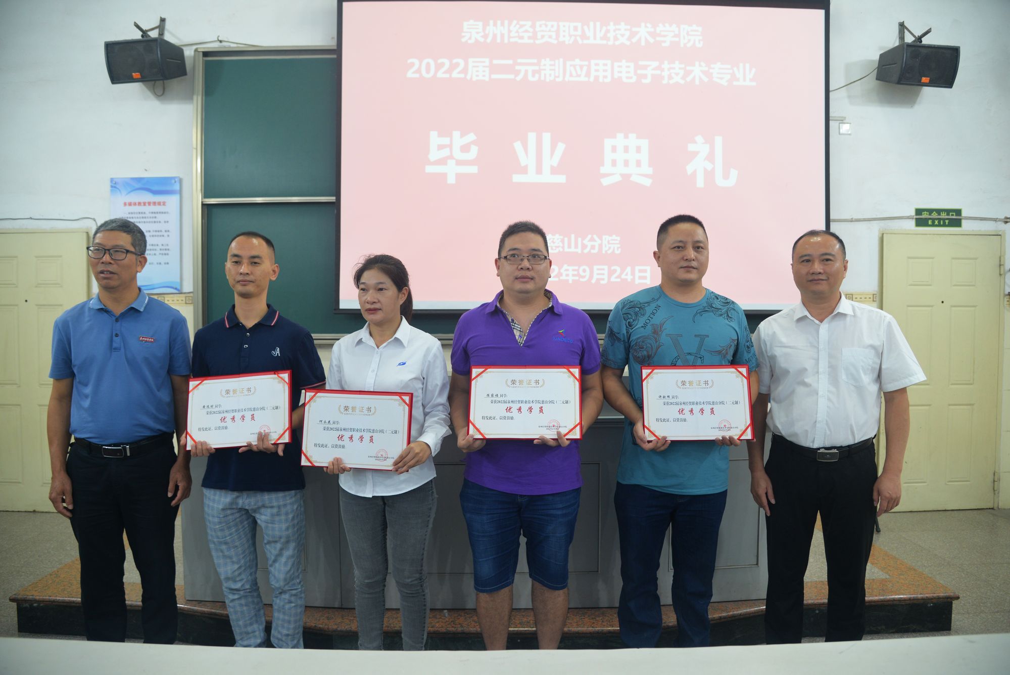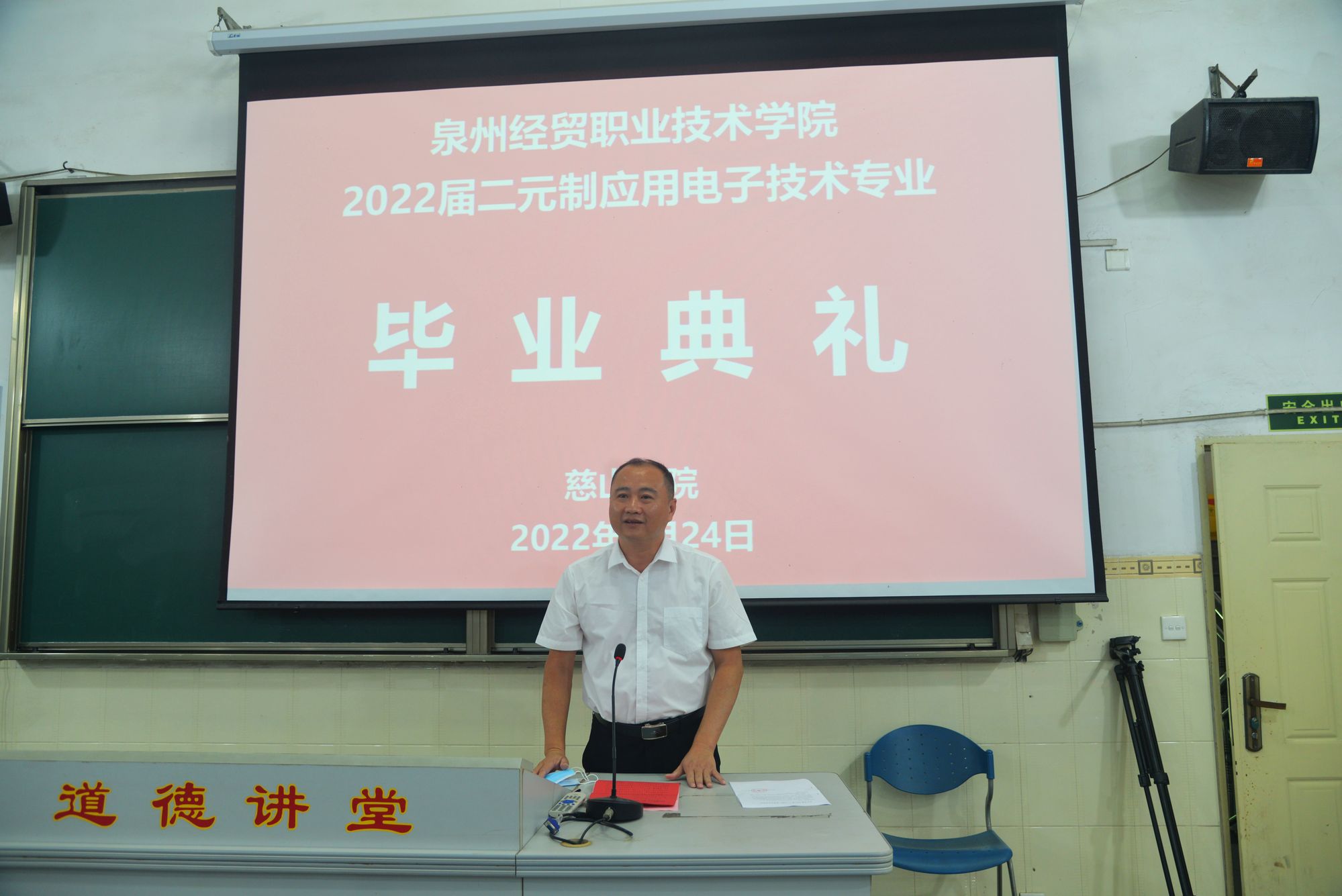 9月24日上午,我院2022届二元制应用电子技术专业毕业典礼在慈山分院举行。泉州半导体高新技术产业园区安溪分园区管理委员会主任白劲松、副主任陈永坚,泉州经贸职业技术学院慈山分院副院长王国阳、李瑞扬出席典礼。园区入驻企业人力资源部主办、慈山分院有关科室领导参加典礼。