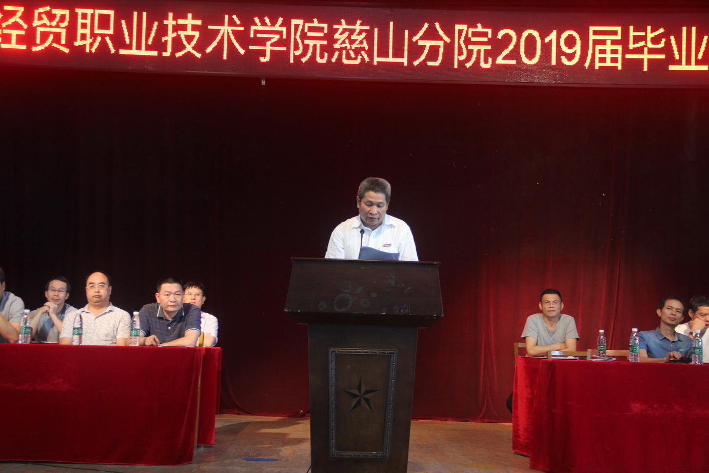 慈山分院院长柯艺灿为班级代表颁发了毕业证书后,发表了热情洋溢的讲话。他首先对同学们的顺利毕业表示热烈的祝贺,并向为同学们成长成才付出辛勤劳动的老师们表示最衷心的感谢。他与同学们一起重温了习近平总书记在纪念五四运动100周年大会上勉励青年的箴言,与大家共勉:一是要勇于砥砺奋斗。他提醒同学说,2019年的高校毕业生人数再创历史新高,面对竞争激烈的就业市场,希望同学们不要好高骛远,要有从最基层、较艰苦的岗位做起的奋斗精神。二是要练就过硬本领。他引述习近平总书记的话说,要增强学习紧迫感,在学习中增长知识、锤炼品格,在工作中增长才干、练就本领。勉励大家脚踏实地,在激烈的社会竞争中创造属于自己的美好未来。三是要锤炼品德修为。他警勉同学们把立德放在为人处事的首要位置,一言一行学好人,一心一意交好人,做到明大德、守公德、严私德。