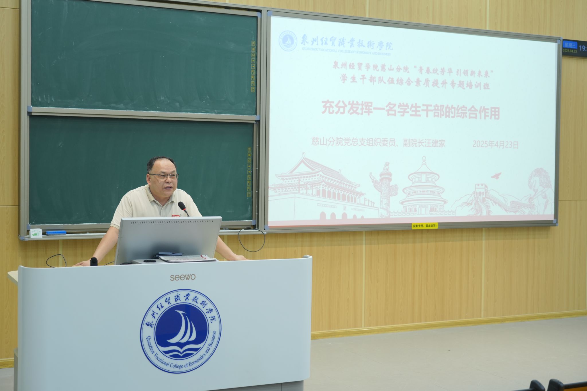 开班仪式结束后,慈山分院副院长汪建家以《充分发挥一名学生干部的综合作用》为题作开班第一讲,他以学生干部的重要性为切入点,围绕职责定位、能力素养、工作方法、成长成才等方面对如何当好学生干部、充分发挥学生干部综合作用展开深入讲解,将理论知识和工作案例相结合,助力学生干部立志成长成才。他要求,全体学生干部要以身作则,为广大学生树立榜样,全心全意为同学服务,用实干和担当提境界、练本领、锻意志,为学校的高质量发展贡献青春力量。