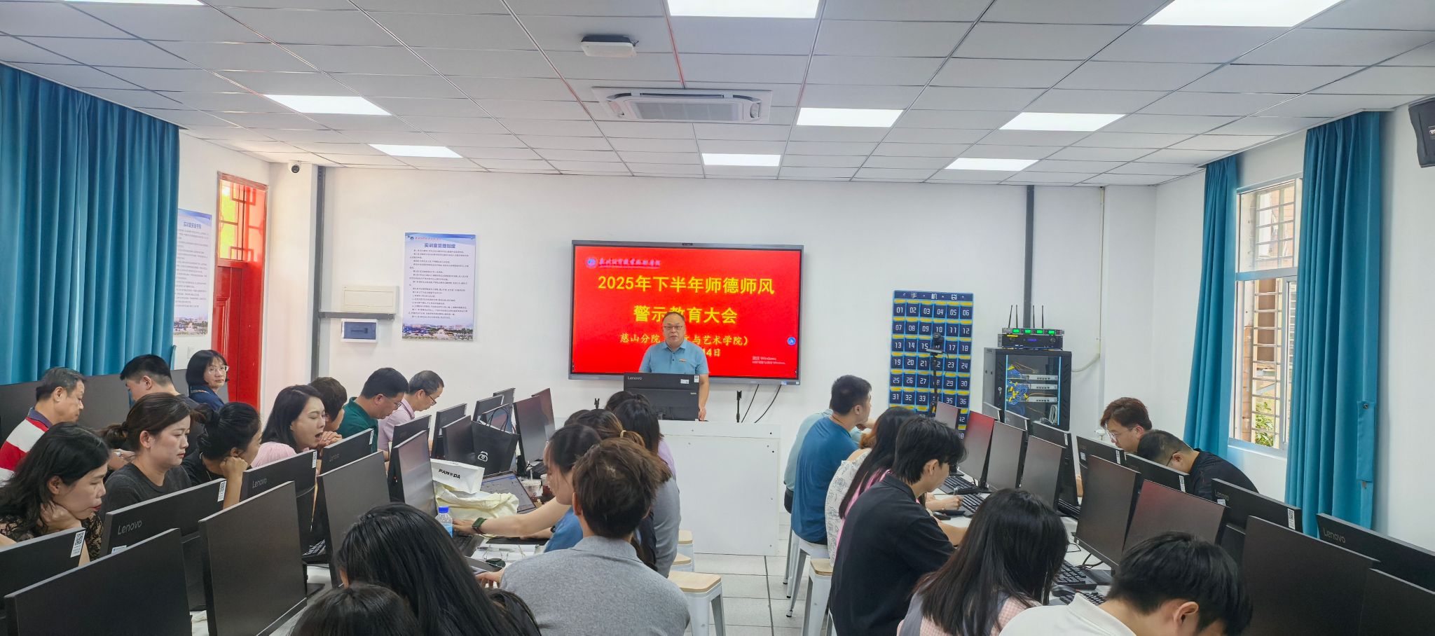 为深入贯彻新时代教师队伍建设要求,全面提升教师职业道德素养,落实立德树人根本任务,营造风清气正的育人环境,2025年10月14日下午,慈山分院(人文与艺术学院)在东教105教室召开2025年下半年师德师风警示教育大会。学校党委委员、慈山分院党总支书记、院长梁松刚出席会议。会议由慈山分院副院长汪建家主持,全体教职工参加。