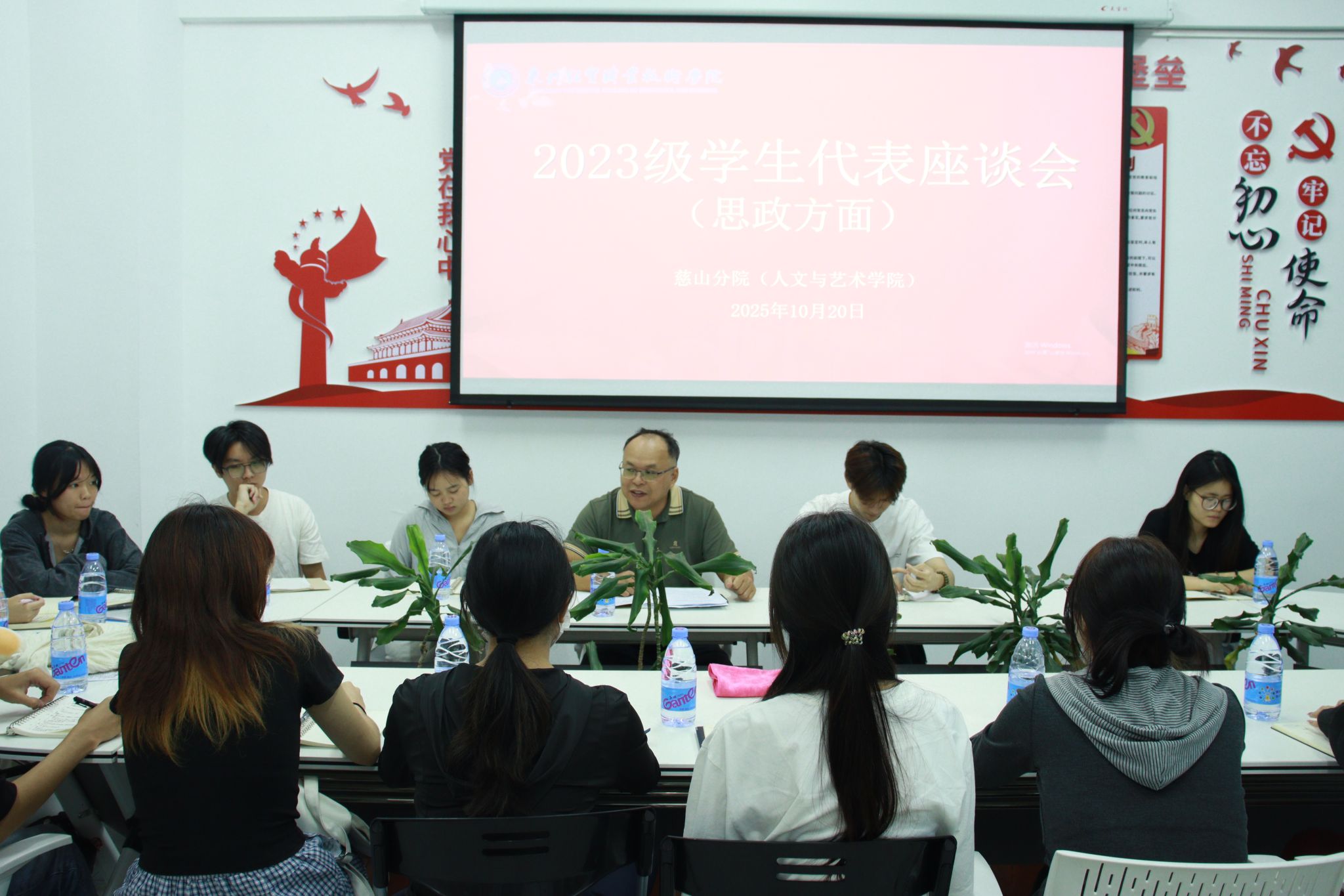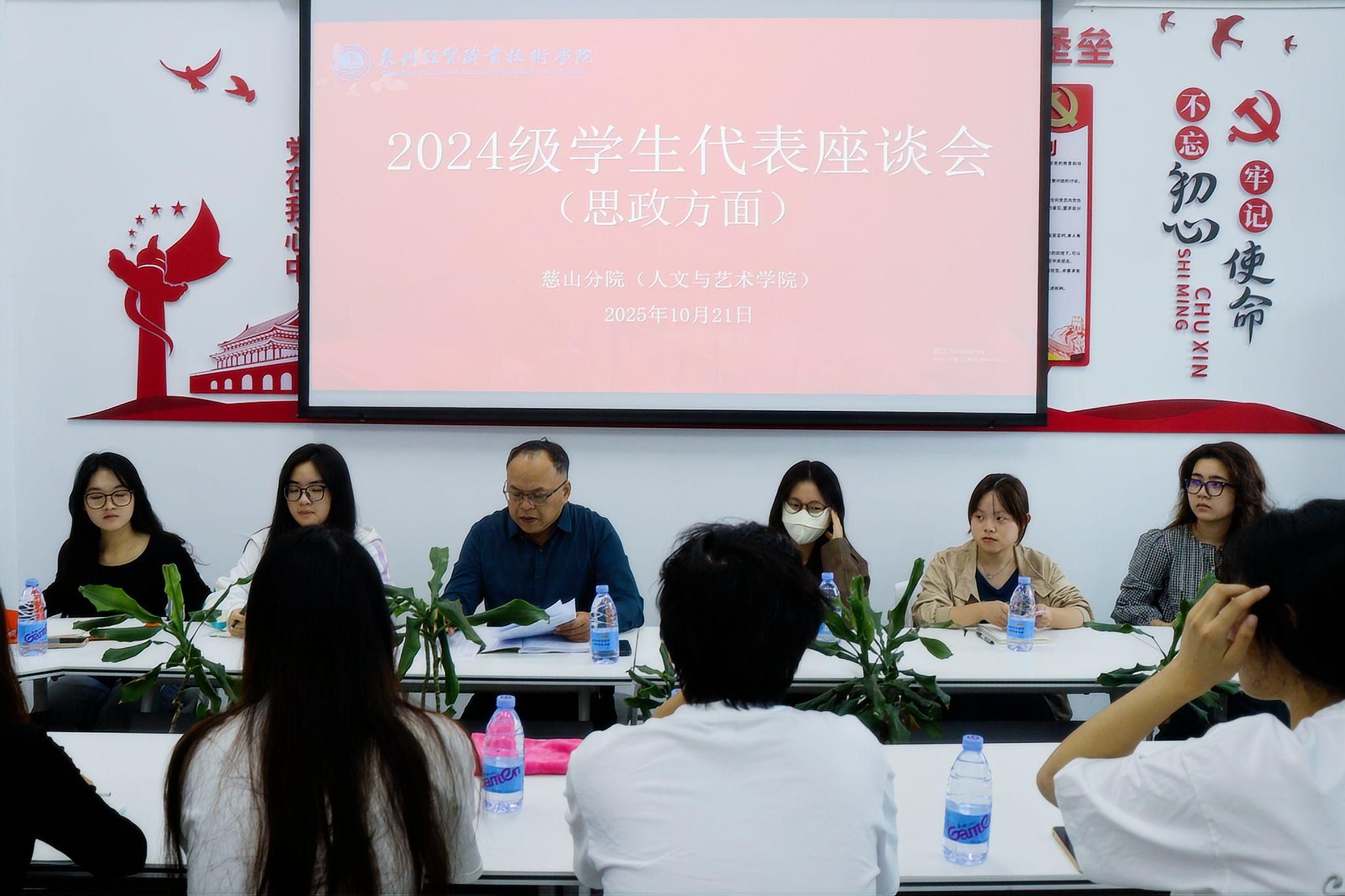 为切实了解学生学业发展与生活状况,广泛听取意见建议,进一步提升育人质量与学生服务水平,近日,慈山分院(人文与艺术学院)于10月中下旬陆续在“一站式”学生社区和东教108会议室分别组织召开了2023级、2024级、2025级学生代表系列座谈会。会议聚焦教育教学、学风建设、生活服务与职业发展等重点议题,学院相关负责人、教师代表及各年级学生代表共同参与。