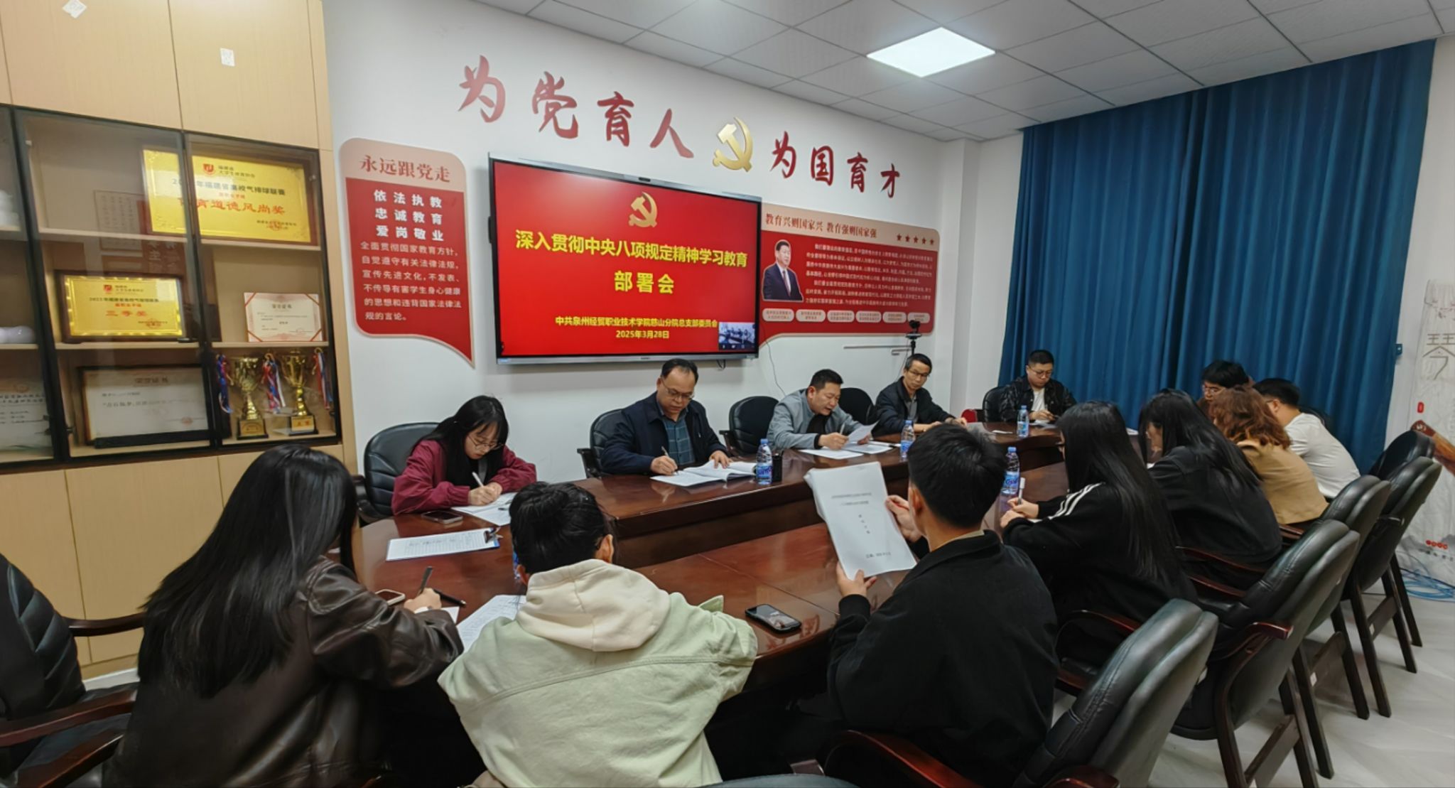 3月28日下午,慈山分院在东教108会议室召开党员大会,传达学校党委关于深入贯彻中央八项规定精神学习教育动员部署会会议精神以及上级有关部署要求,对慈山分院开展深入贯彻中央八项规定精神学习教育进行安排部署,启动学习教育工作。慈山分院全体党员参加会议。学校党委委员、慈山分院党总支书记、院长梁松刚主持会议并讲话。
