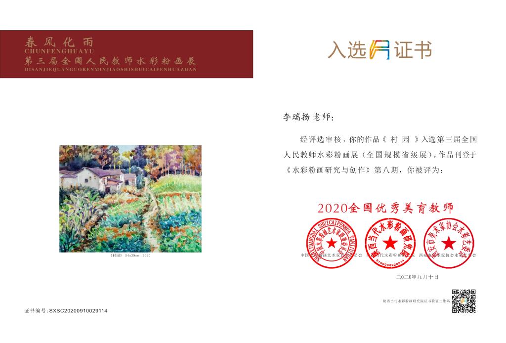 我分院李瑞扬老师水彩作品《村园》入选第三届人民教师水彩粉画展,并被组委会评为“2020全国优秀美育教师”。