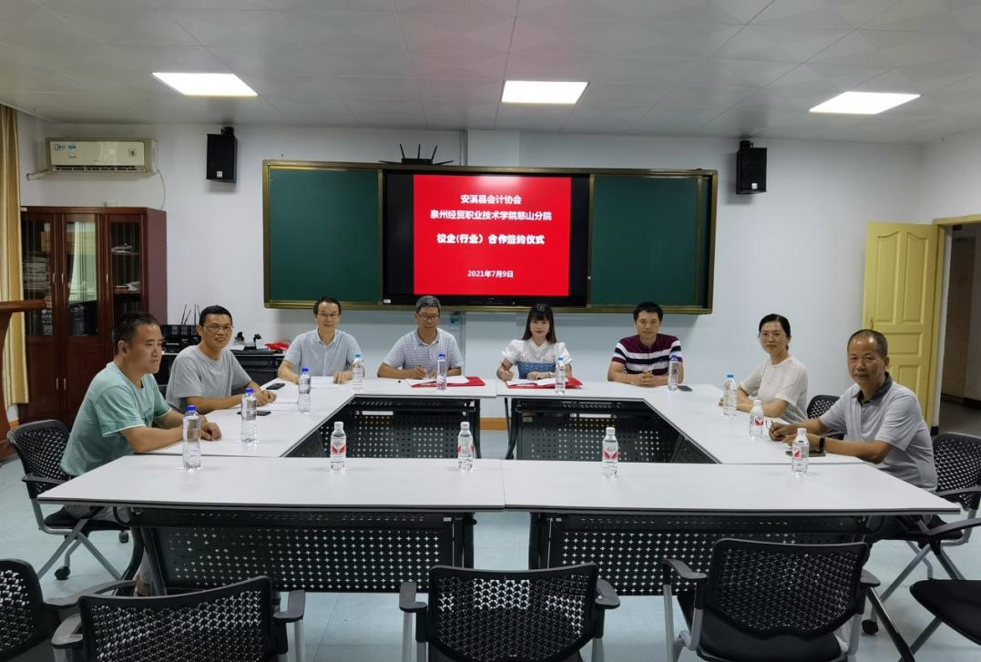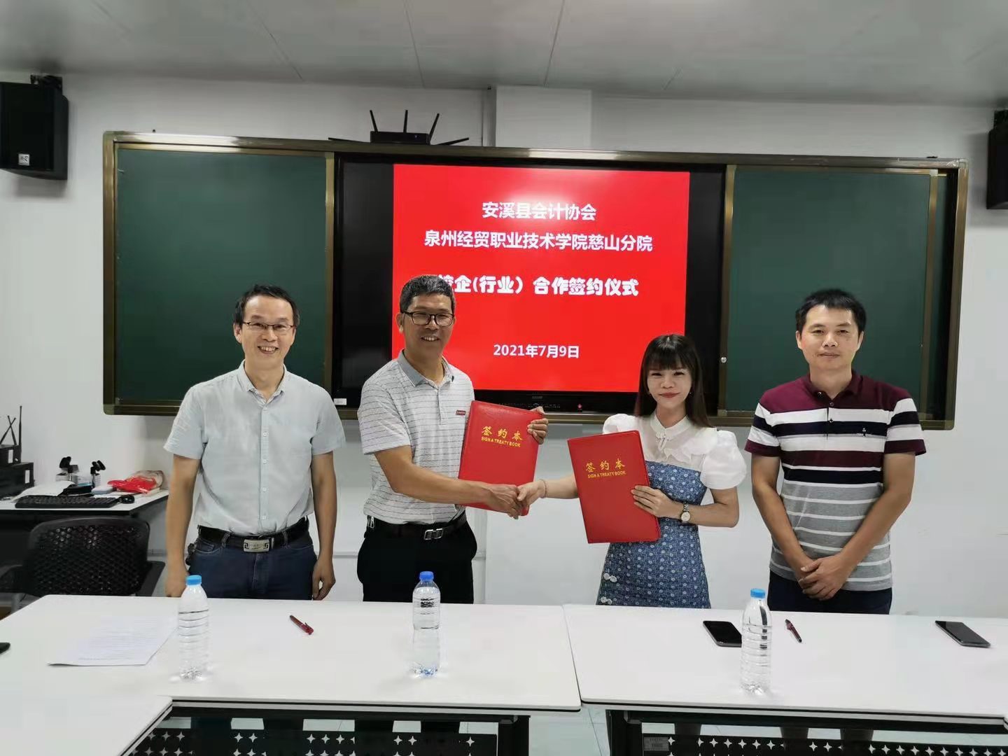 7月9日,慈山分院与安溪县会计协会在分院教学楼多功能室举行校企(行业)合作签约仪式。慈山分院副院长王国阳,安溪县会计协会会长苏清香、秘书长黄江勇出席签约仪式,仪式由教务科科长王怀阳主持。