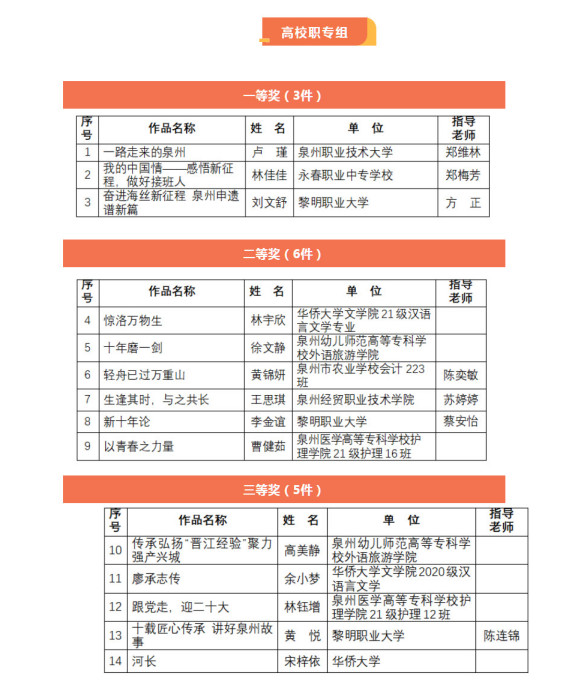 慈山分院学子王思琪(广告211班、指导老师苏婷婷)在由泉州市委宣传部主办的“奋进新征程 建功新时代‘我们这十年’”主题征文大赛中荣获二等奖。此次征文大赛分小学组、中学组、高校职专组、社会组等四个组别,高校职专组共评出获奖作品14件,其中一等奖3件、二等奖6件、三等奖5件。