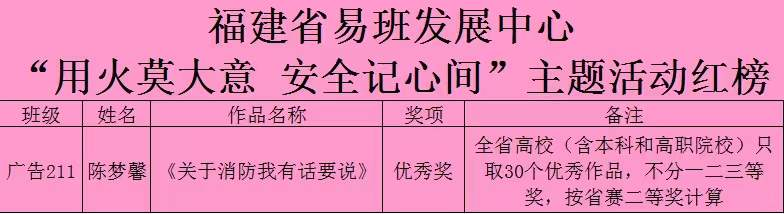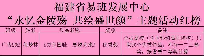 近日,福建省易班发展中心公布“永忆金陵殇 共绘盛世颜”、“用火莫大意 安全记心间”两项主题活动获奖名单。分院学生积极参加,两项作品荣获优秀奖,全省高校(含本科和高职院校)只取30个优秀作品,不分一二三等奖,按省赛二等奖计算。