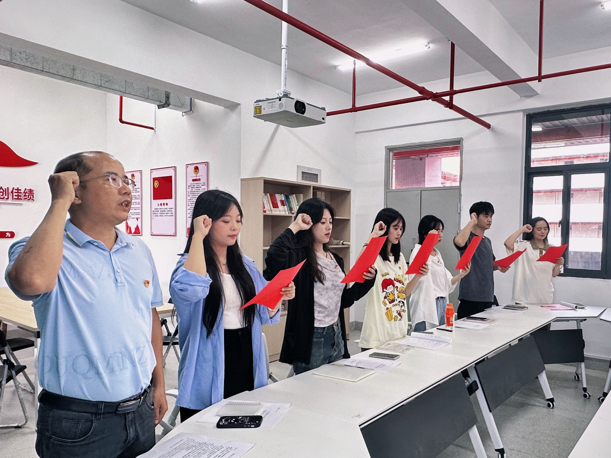 在喜迎中国共产党成立103周年之际,为深入学习贯彻习近平总书记关于党纪学习教育的重要讲话和指示批示精神,进一步加强党员教育,强化新党员身份认同和党组织凝聚力,7月1日下午,慈山分院第一党支部在党团学活动室举行“七一”新党员入党宣誓仪式。慈山分院第一党支部全体党员以及新接收的6名中共预备党员参加仪式。仪式由支部书记张水波主持并领誓,学院党委委员、慈山分院党总支书记、院长梁松刚监誓。
