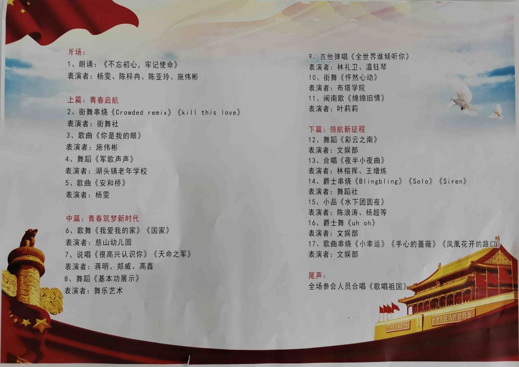 晚会在激情澎湃的朗诵《不忘初心 牢记使命》中拉开了帷幕。热情似火的串烧舞,点燃了观众们的激情,现场热血沸腾。湖头老年学校友情演出的《军歌声声》赢得掌声阵阵,他们的活力风采和年轻心态让同学们由衷地赞叹。慈山幼儿园教师、学生及家长同台演绎了《我爱我的家》、《国家》,表演者的默契与温情,以舞姿注释了“家是幸福的洋溢”。布塔学院的街舞《怦然心动》活力四射,激起全场阵阵掌声和尖叫。整台演出高潮迭起,掌声不断,演员们用悦耳的歌声、优美的舞姿、真挚的感情,赞美新生活,凝聚新能量。晚会在气势雄浑的大合唱《歌唱祖国》中圆满落下帷幕,场上参演人员与台下观众齐声高歌,唱出了对伟大祖国最真挚的情感。